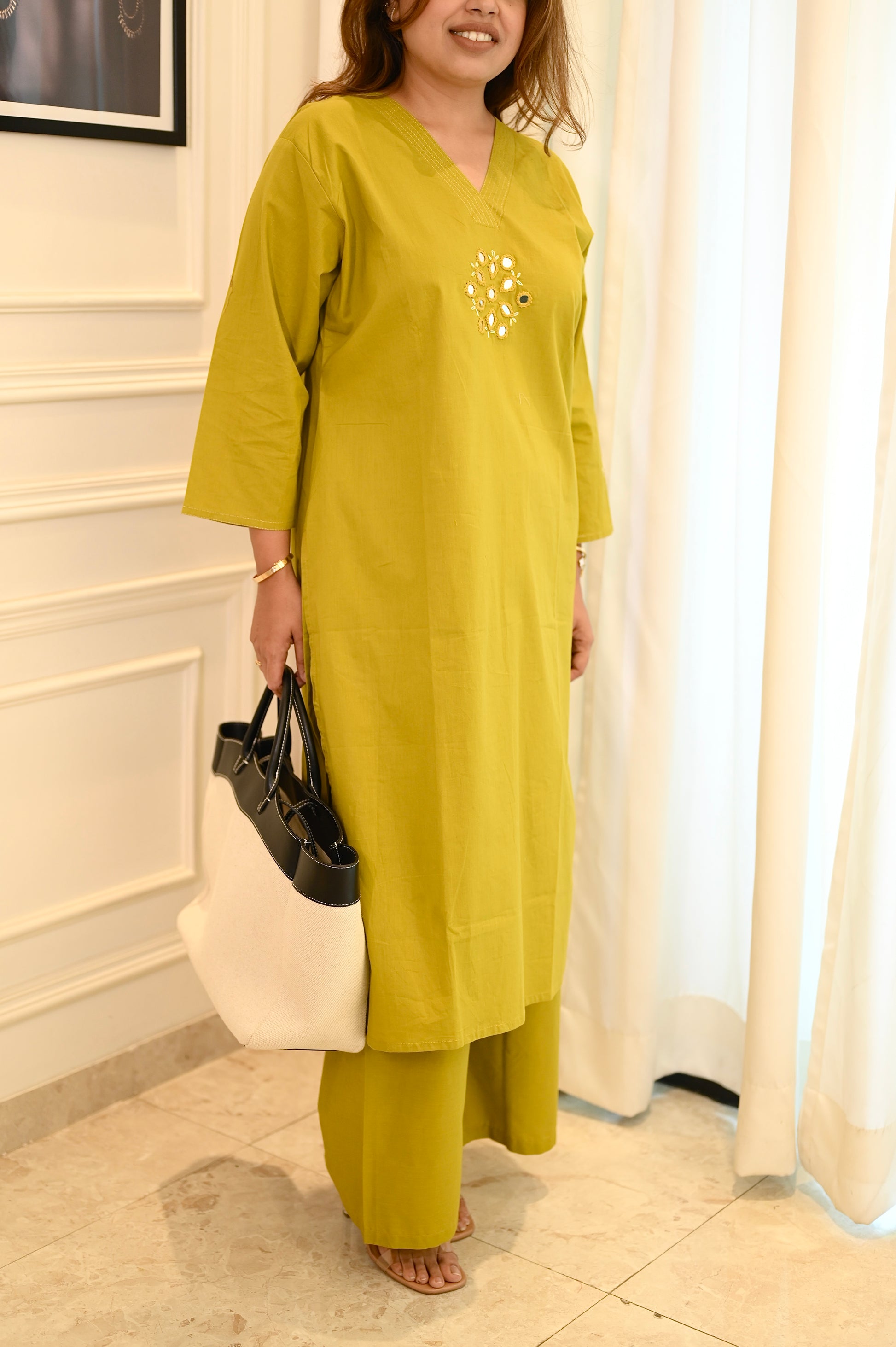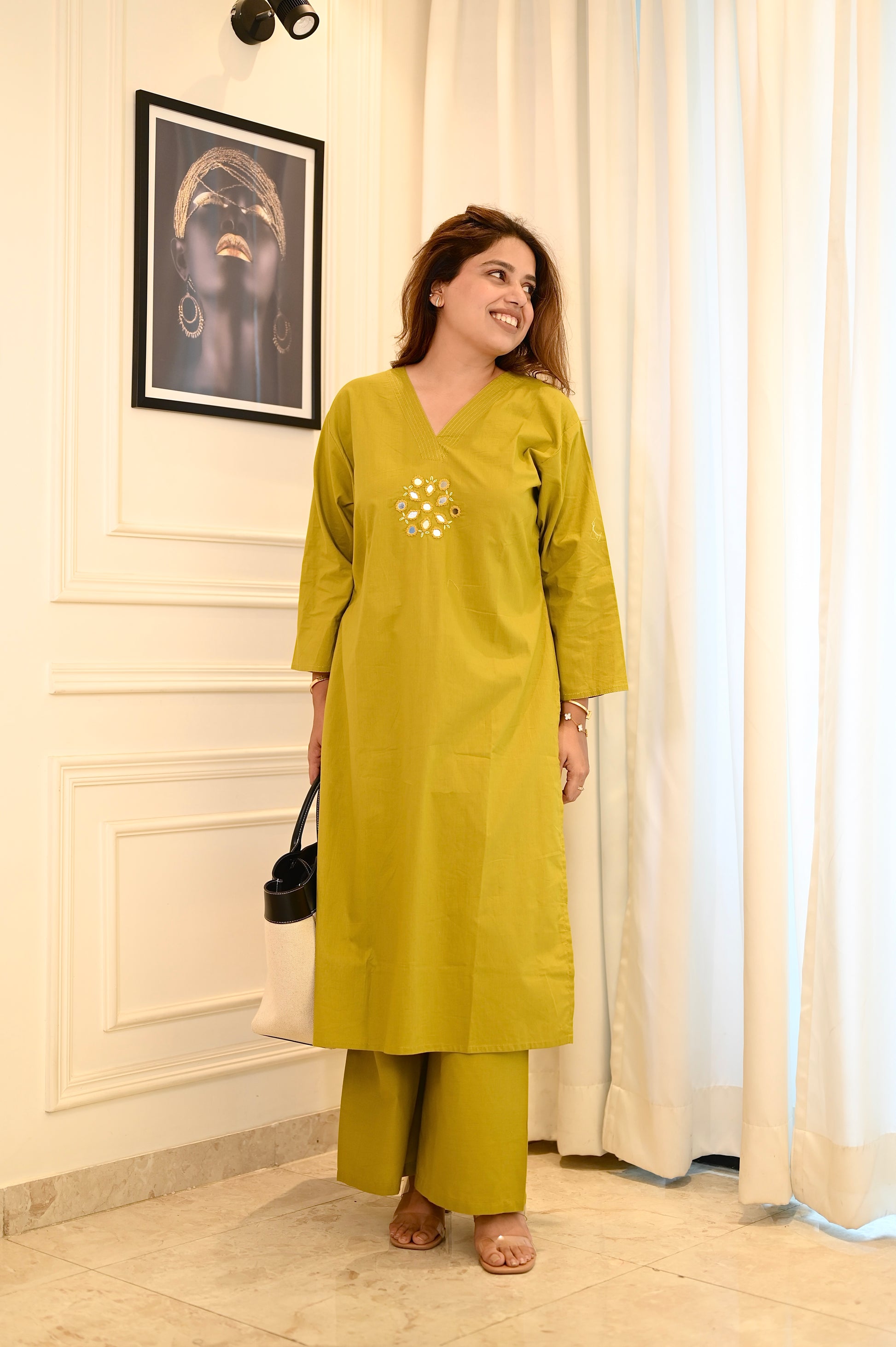 Featuring a flattering V-neckline and a relaxed straight fit, the kurta is adorned with delicate mirror work on the front, adding just the right touch of charm.