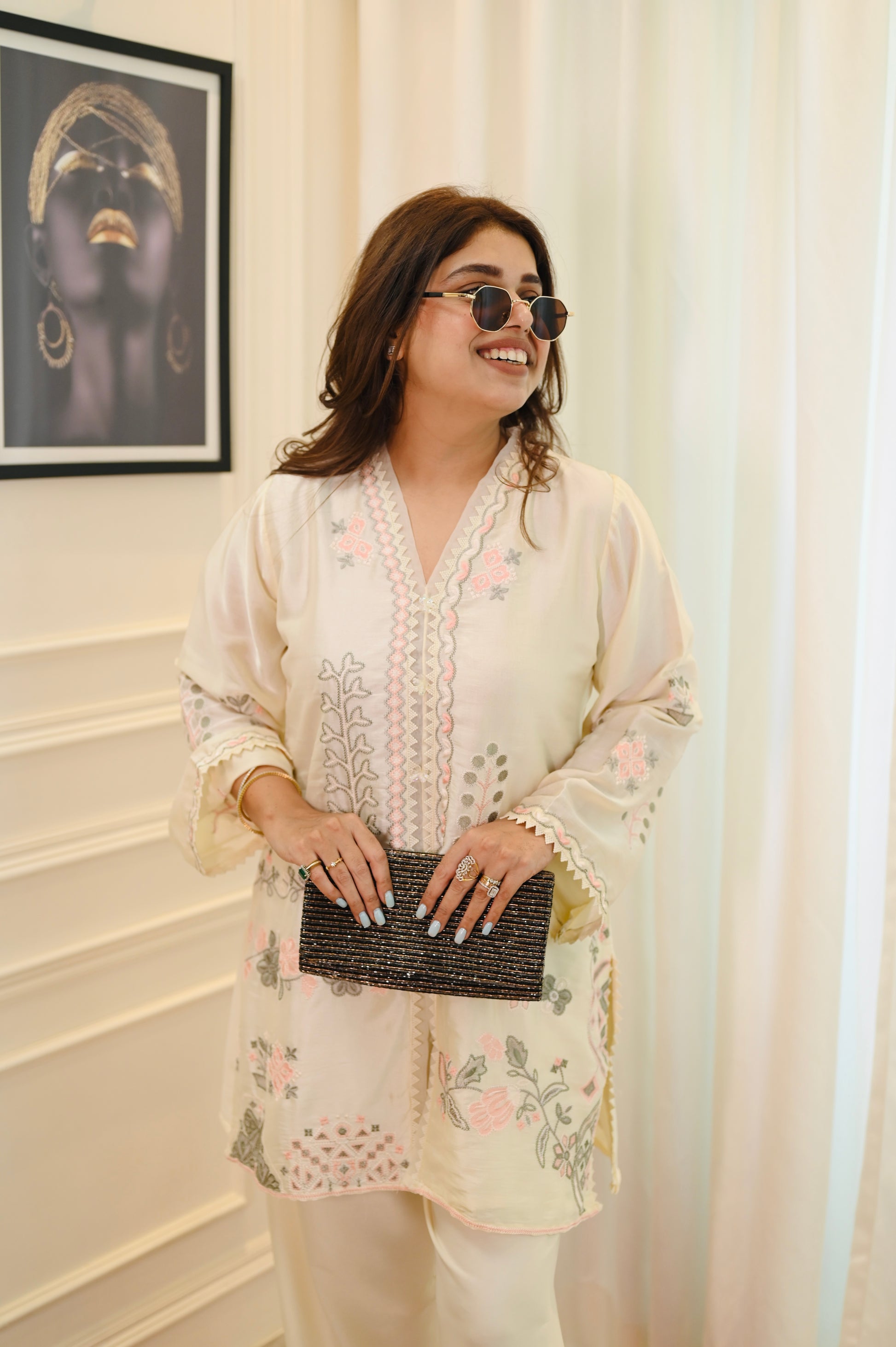 - Elegant pastel-toned outfit with detailed embroidery on the front and sleeves.