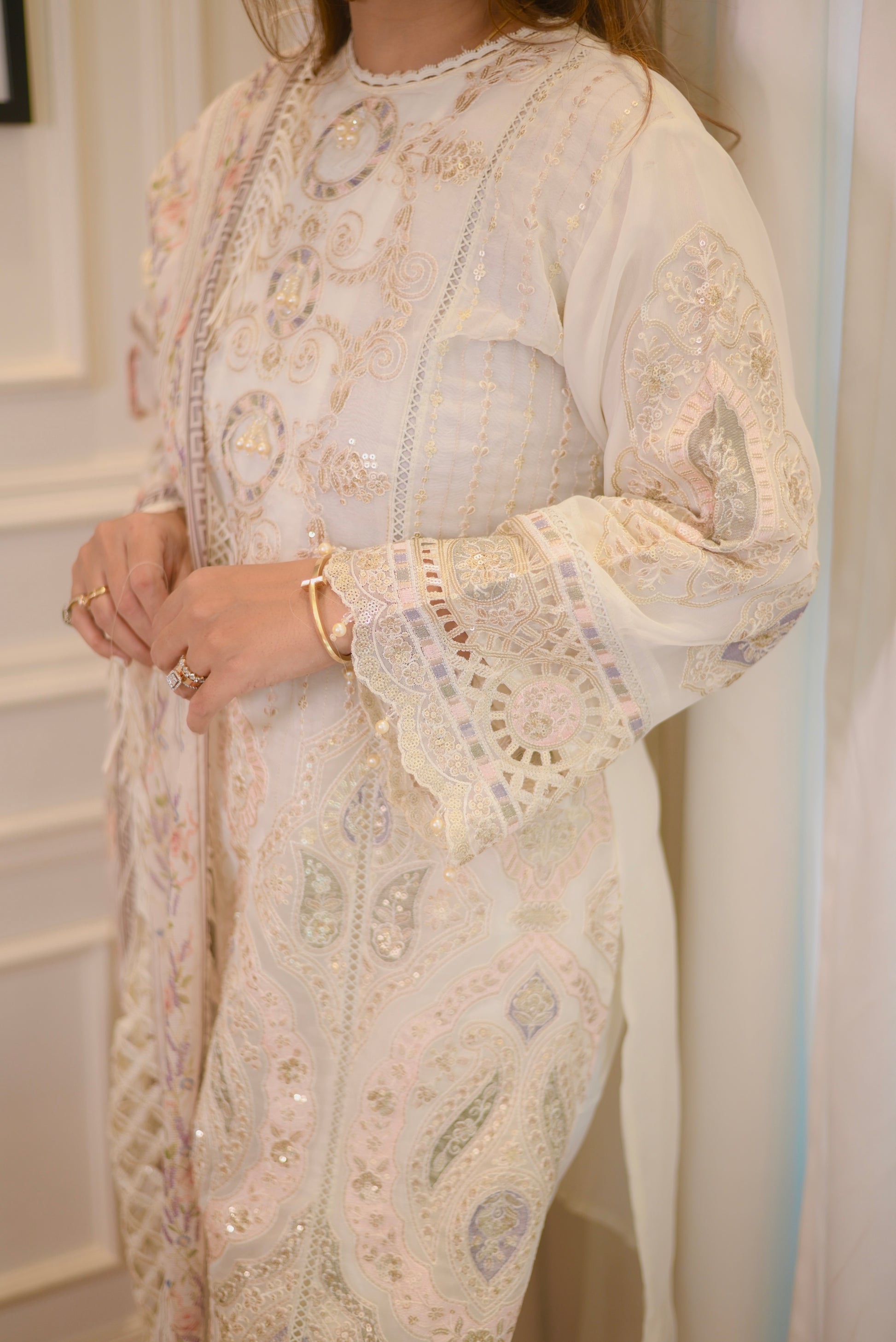 - Elegant pastel-toned outfit with detailed embroidery on the front and sleeves.
