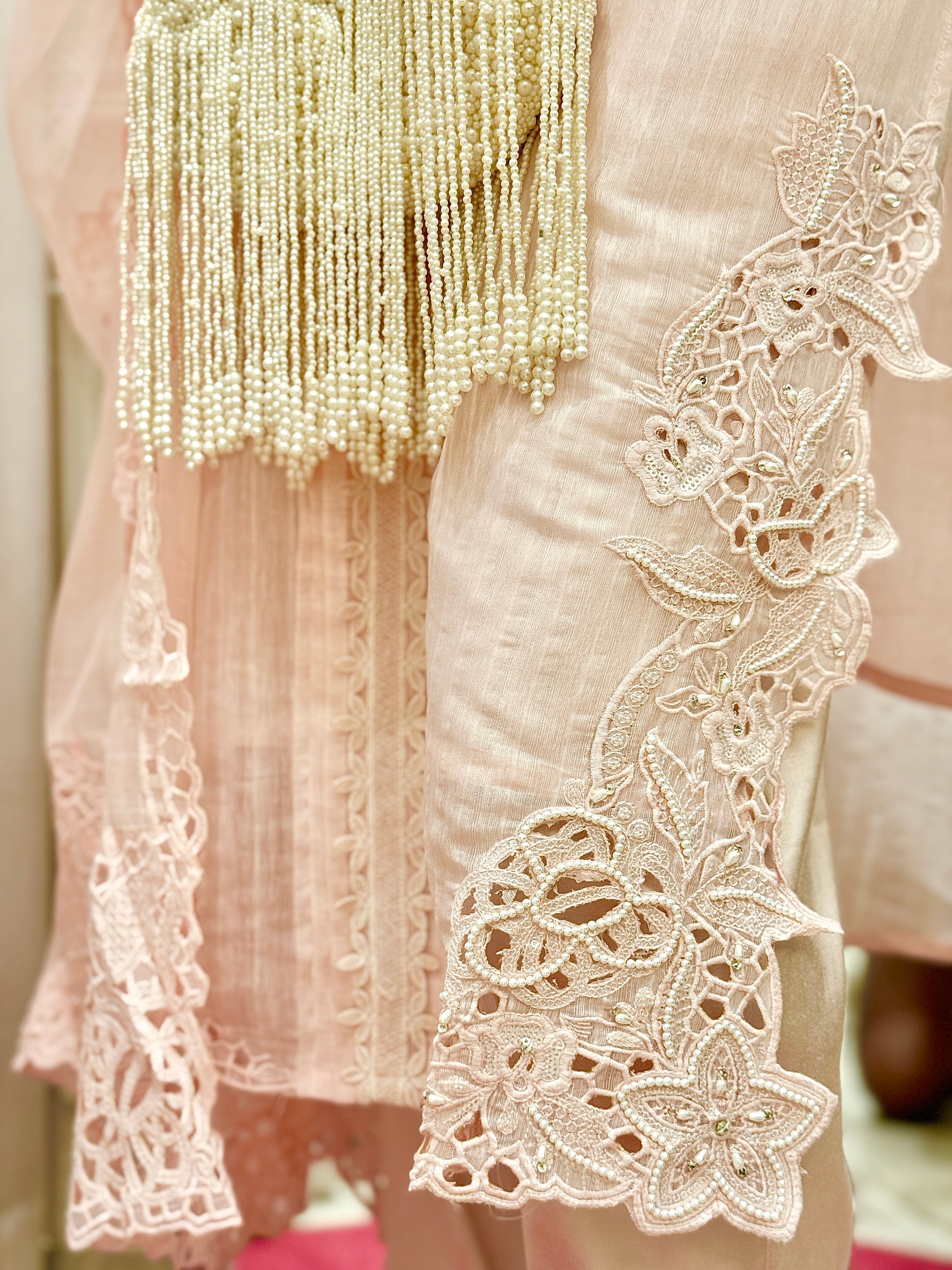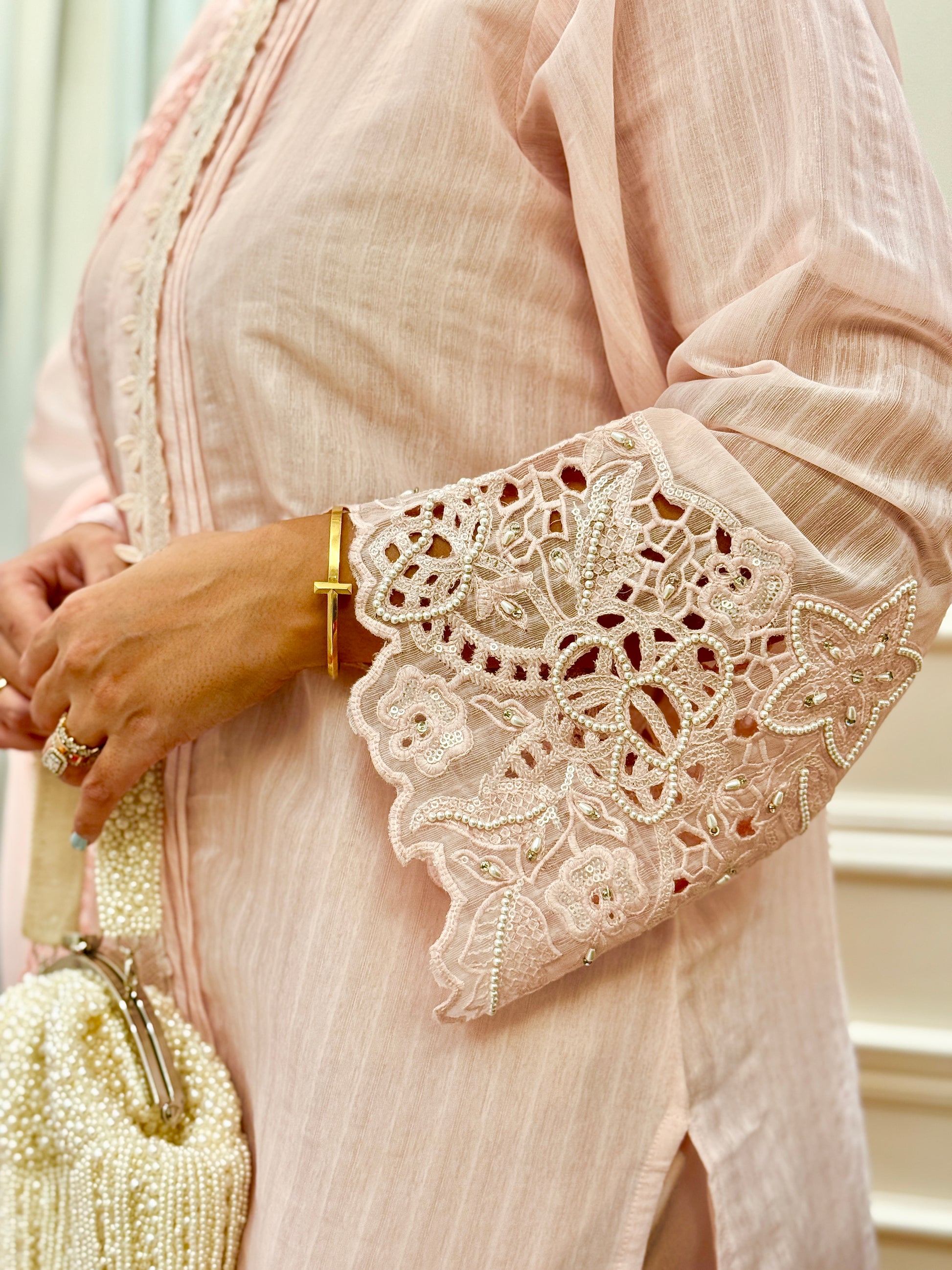 - Graceful dusty Pink outfit adorned with detailing on the neckline and cut work sleeves.