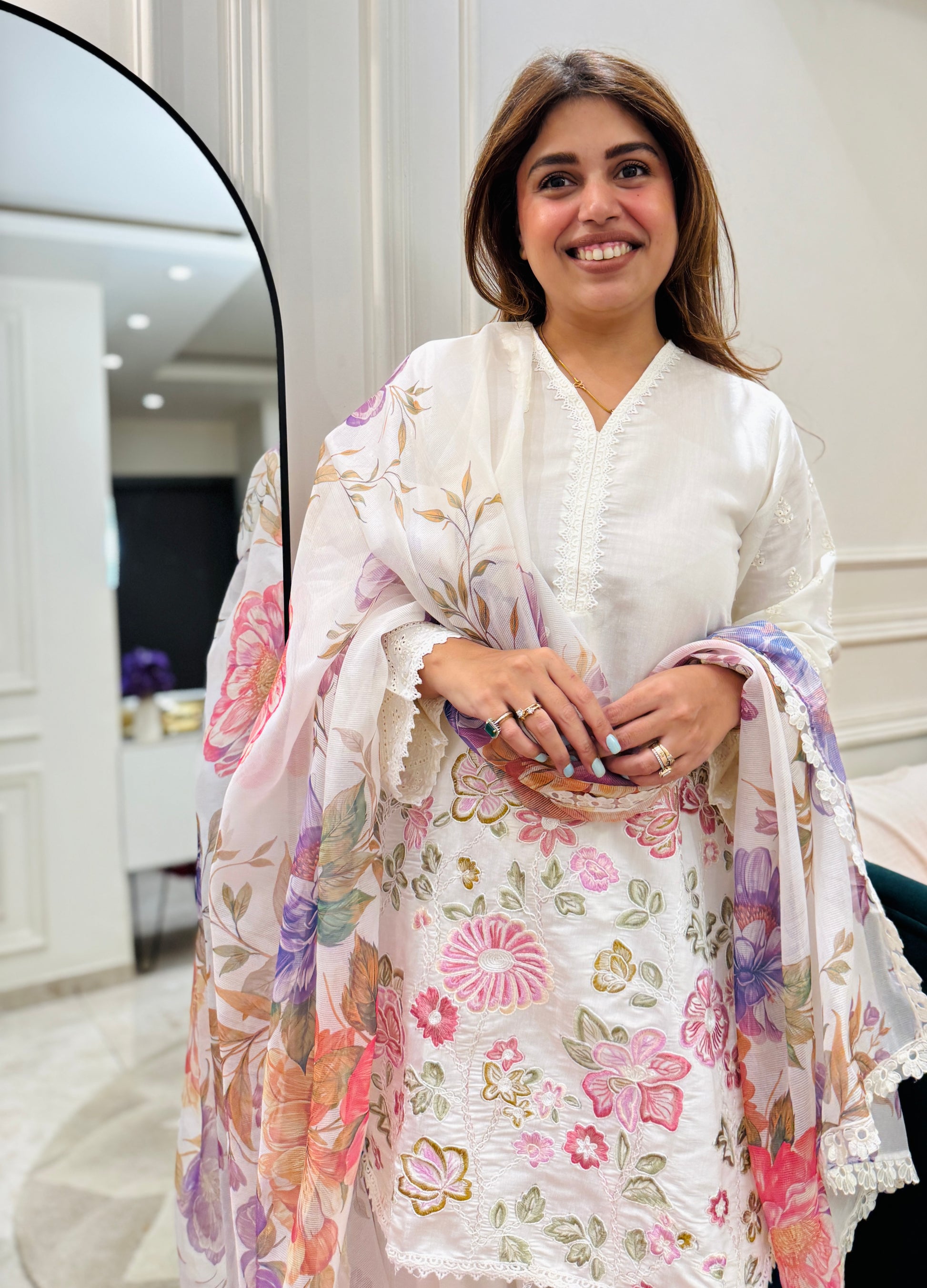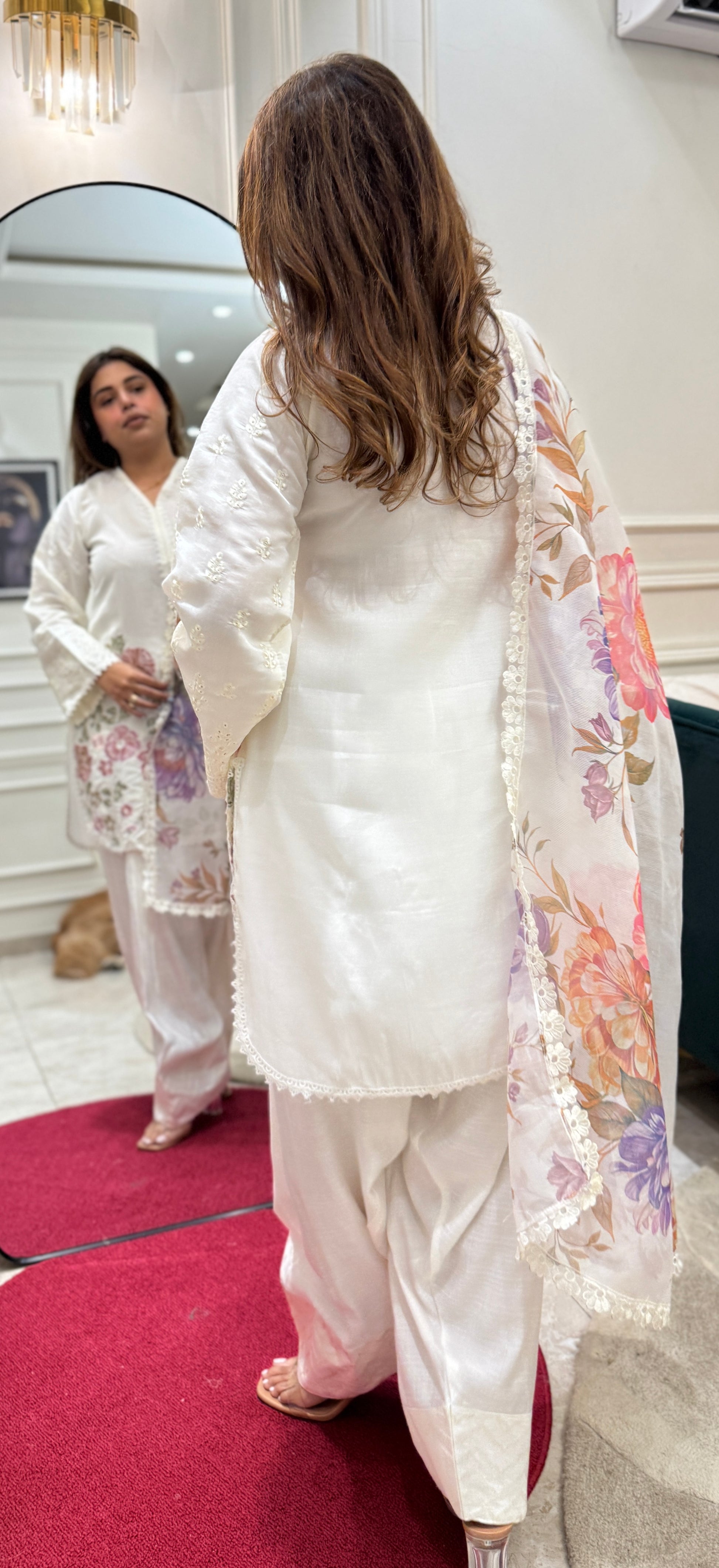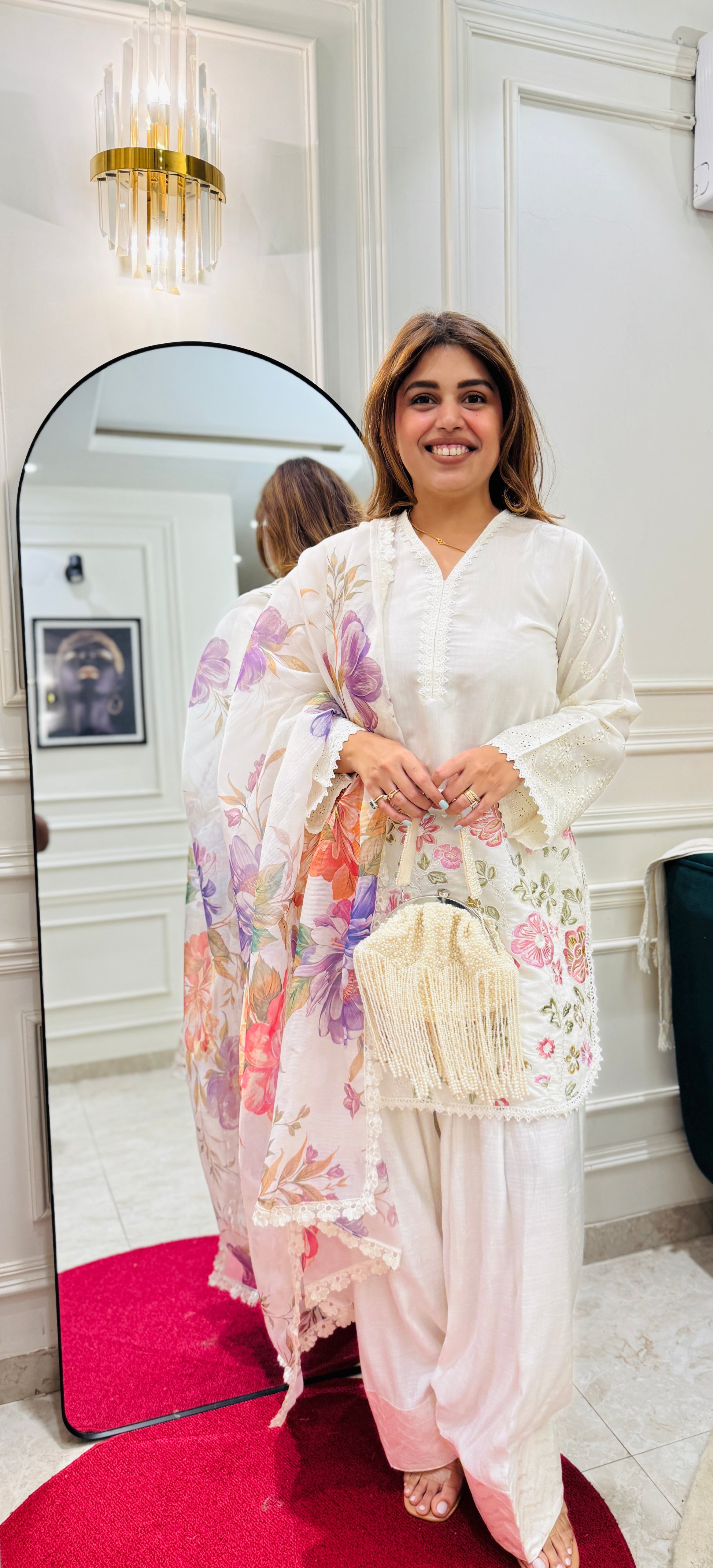 - Lightweight chiffon dupatta with delicate embroidery and lace edging for a refined touch.