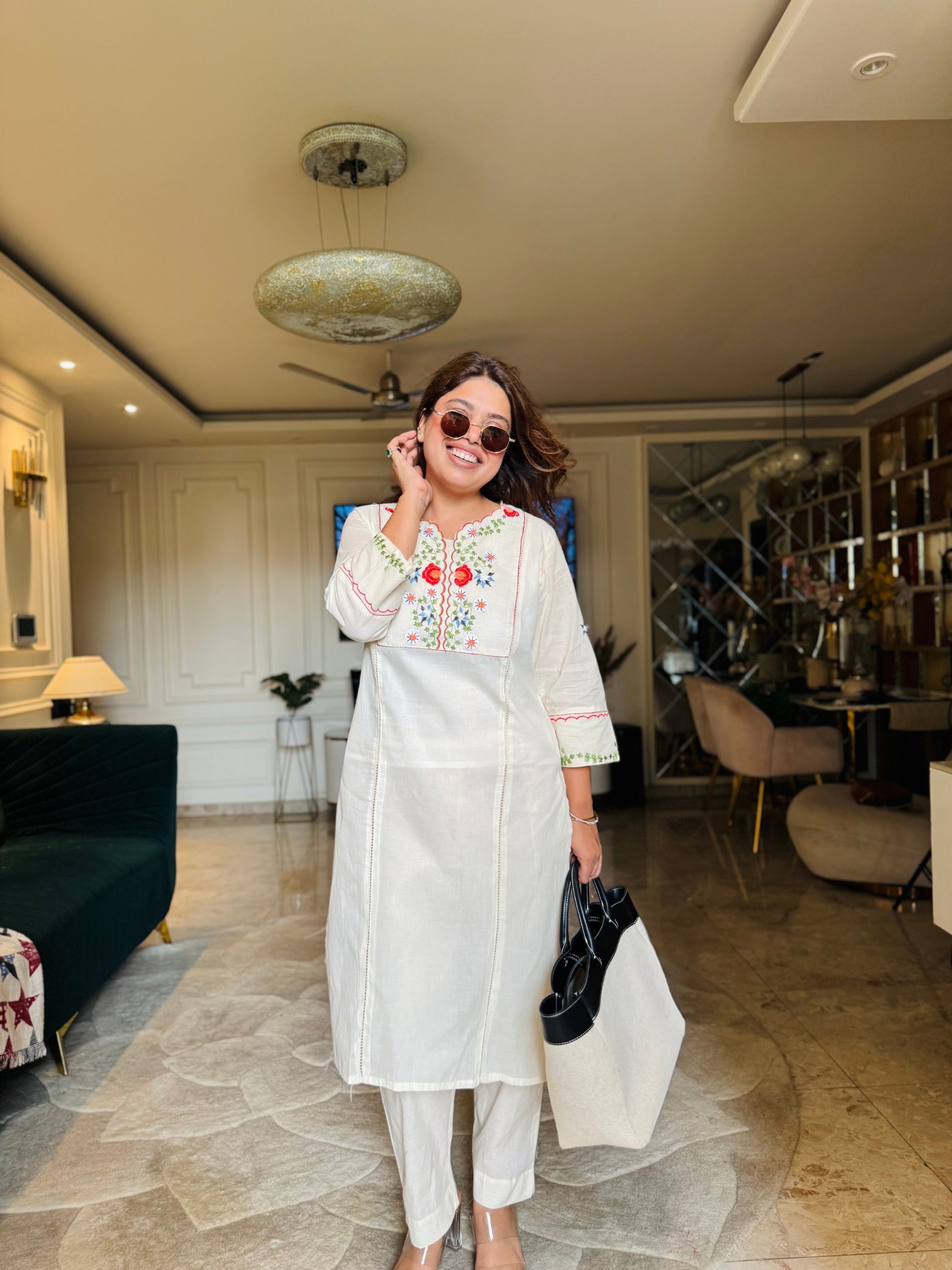 Graceful and summer-ready, this ivory cotton kurta set features vibrant floral embroidery and matching straight pants for effortless everyday elegance. Perfect for brunches, light festive wear, or workdays with a chic twist.