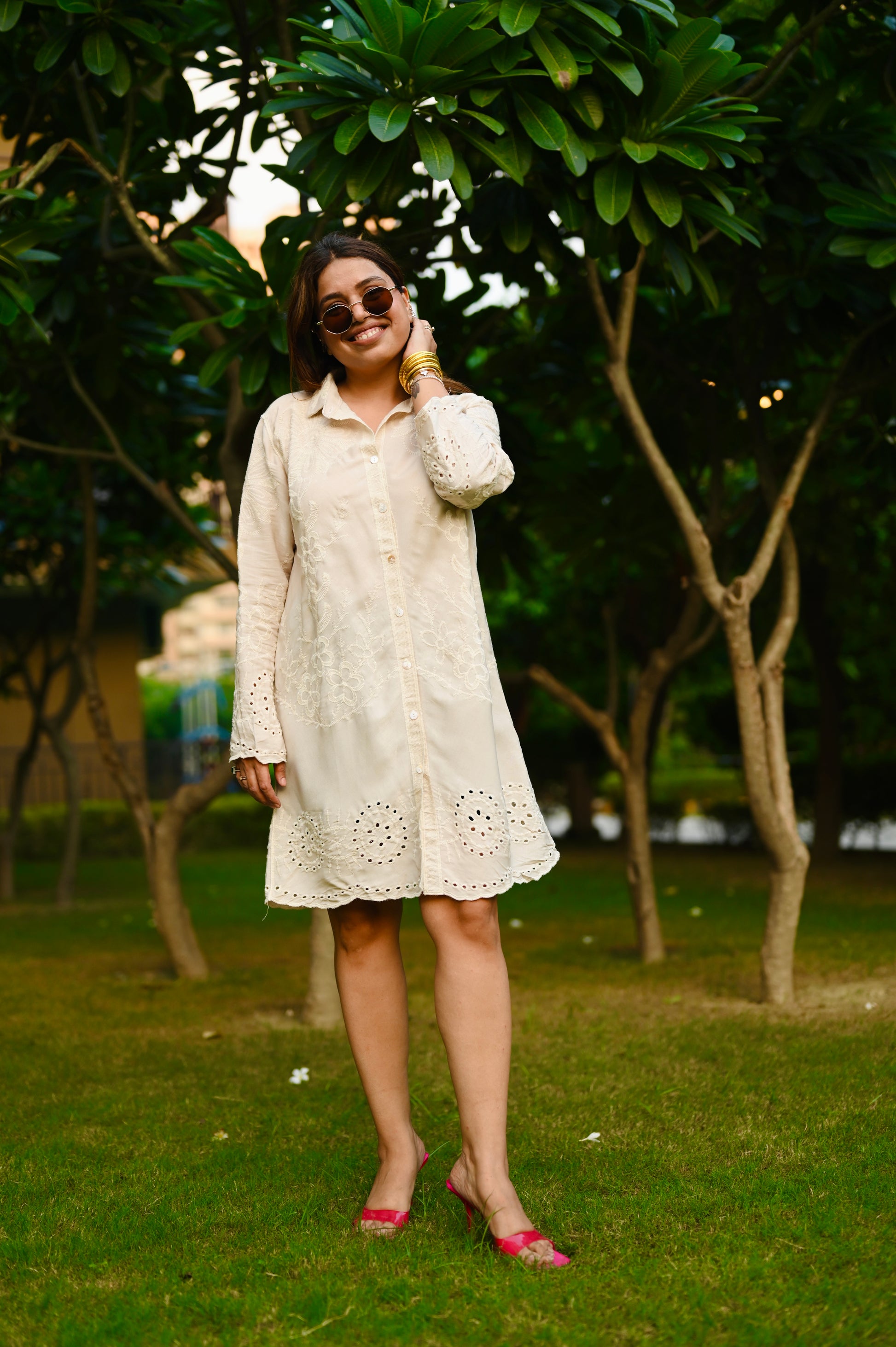 Ivory Shirt Dress with Delicate Thread Embroidery – Free Size Upto XL