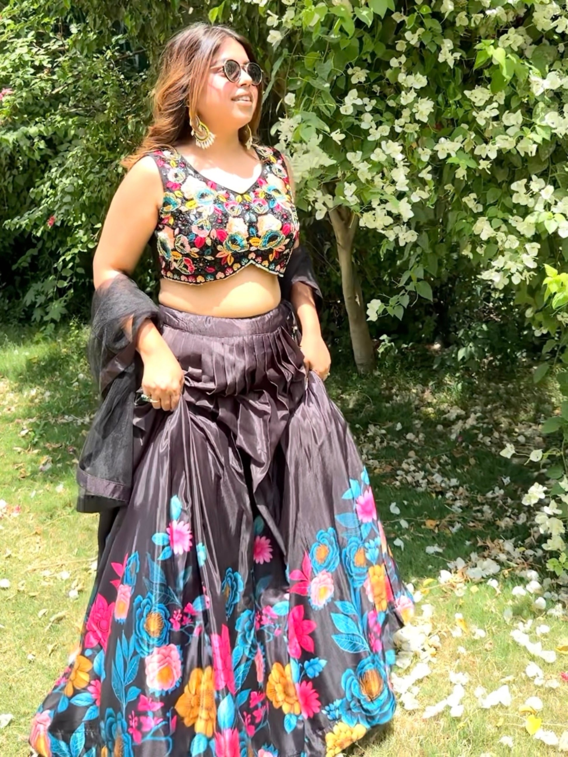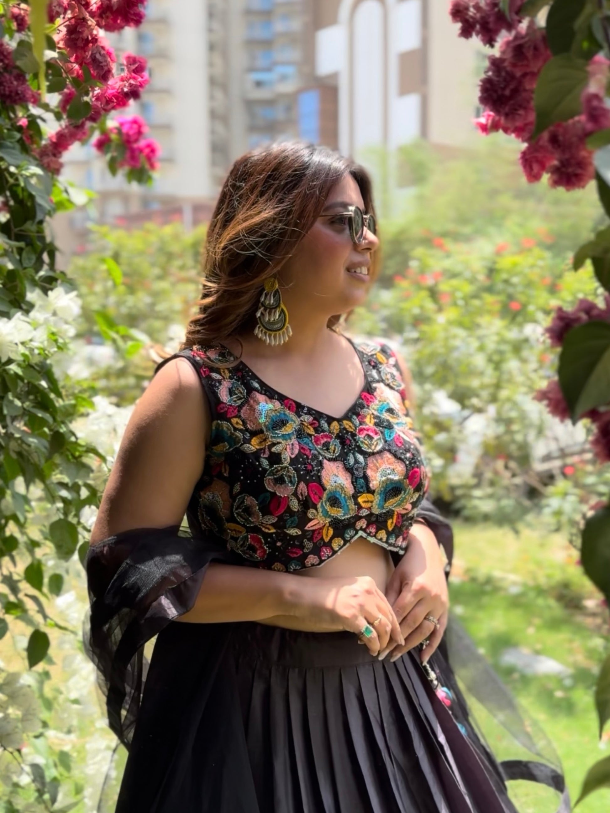 Make a bold statement with this Midnight Bloom Lehenga Set, featuring a rich black base adorned with vibrant floral embroidery. The lehenga skirt is crafted from soft silk-blend fabric with multi-color floral prints along the hem, adding a refreshing pop of color. The sleeveless blouse is heavily embroidered with mirror and threadwork, making it a true showstopper. The look is completed with a sheer black organza dupatta that adds elegance and balance to the bright, festive vibe.