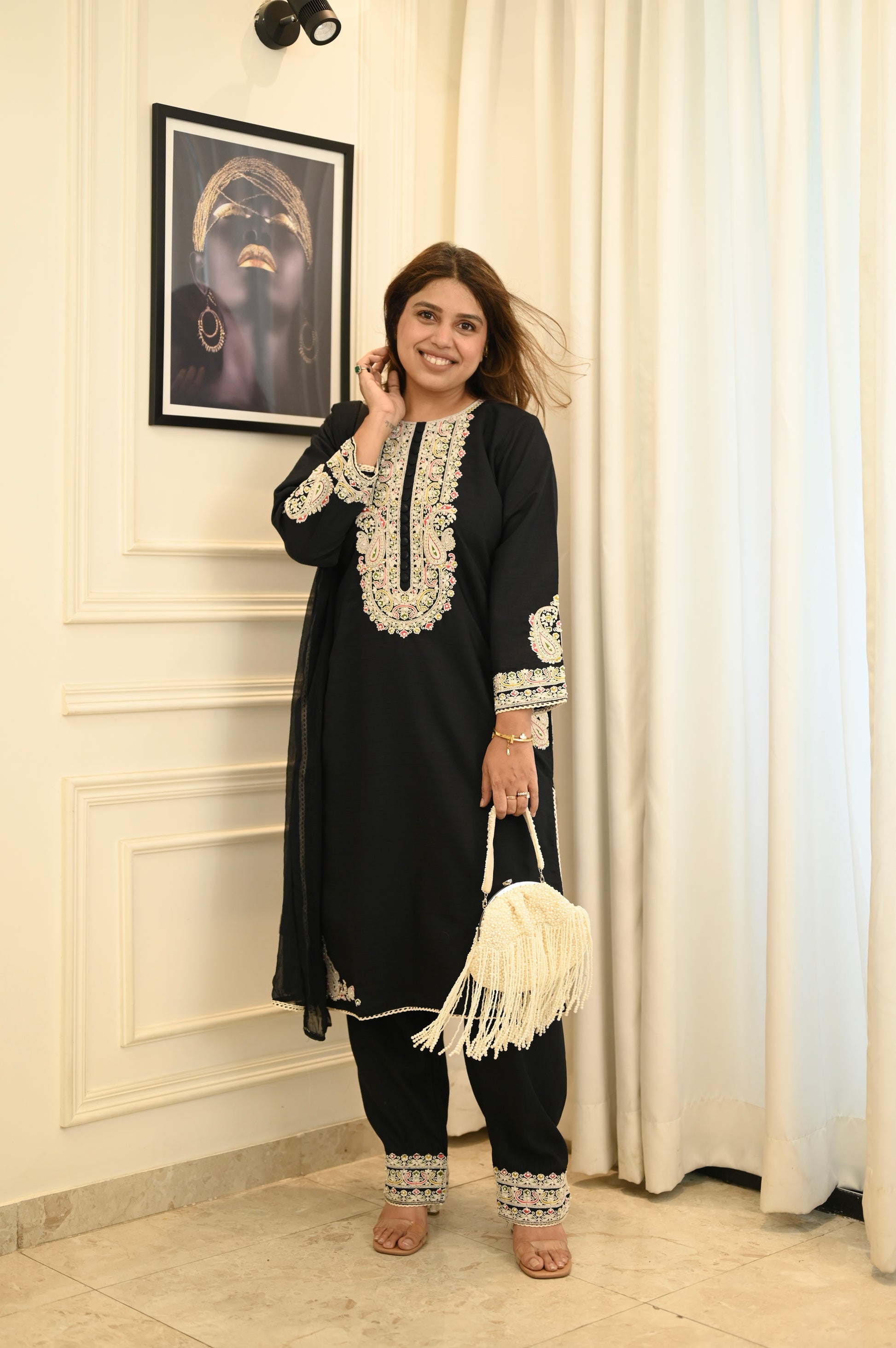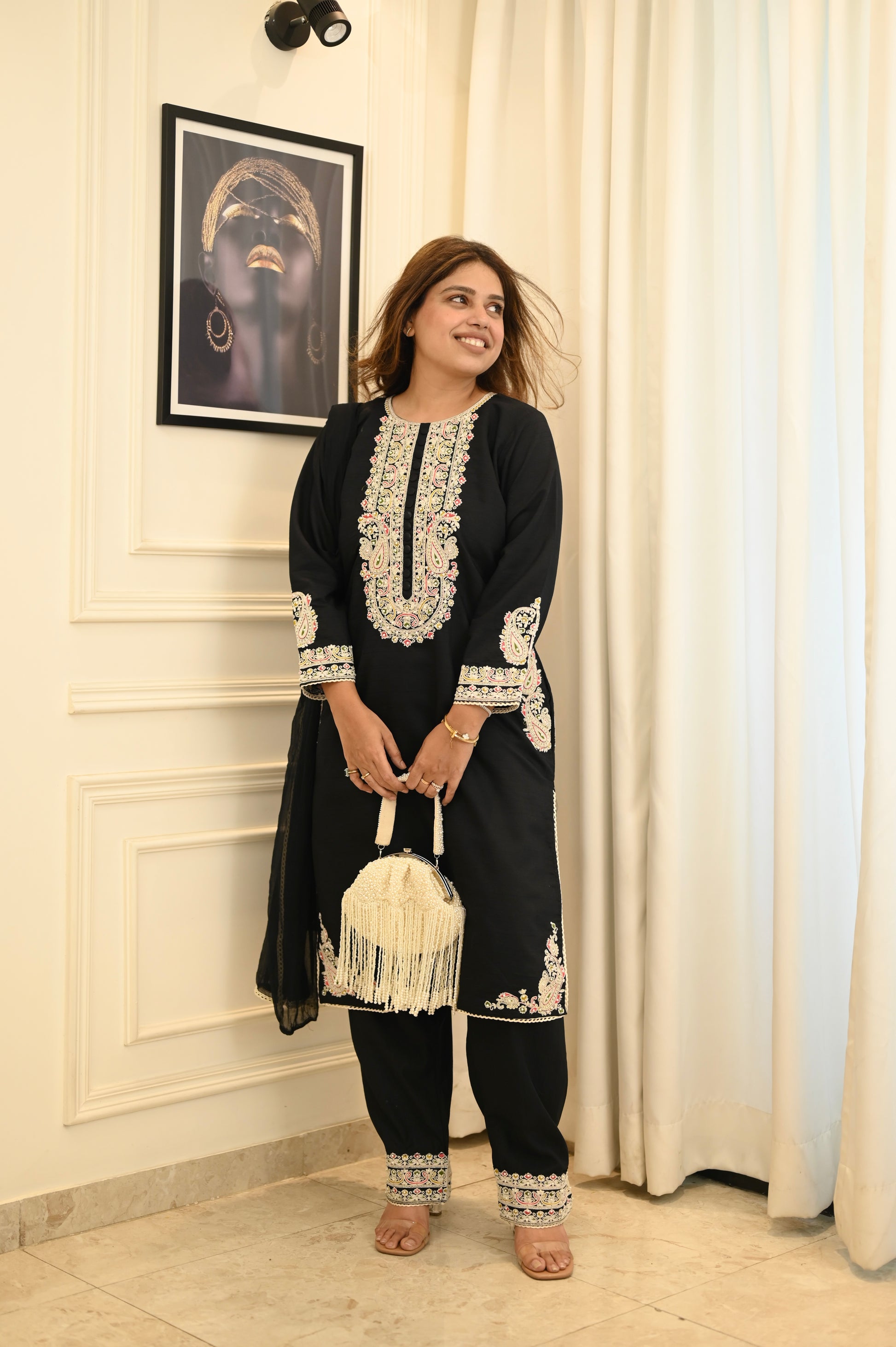 - Fit: Straight-cut kurta with matching pants and Black Chiffon Dupatta.