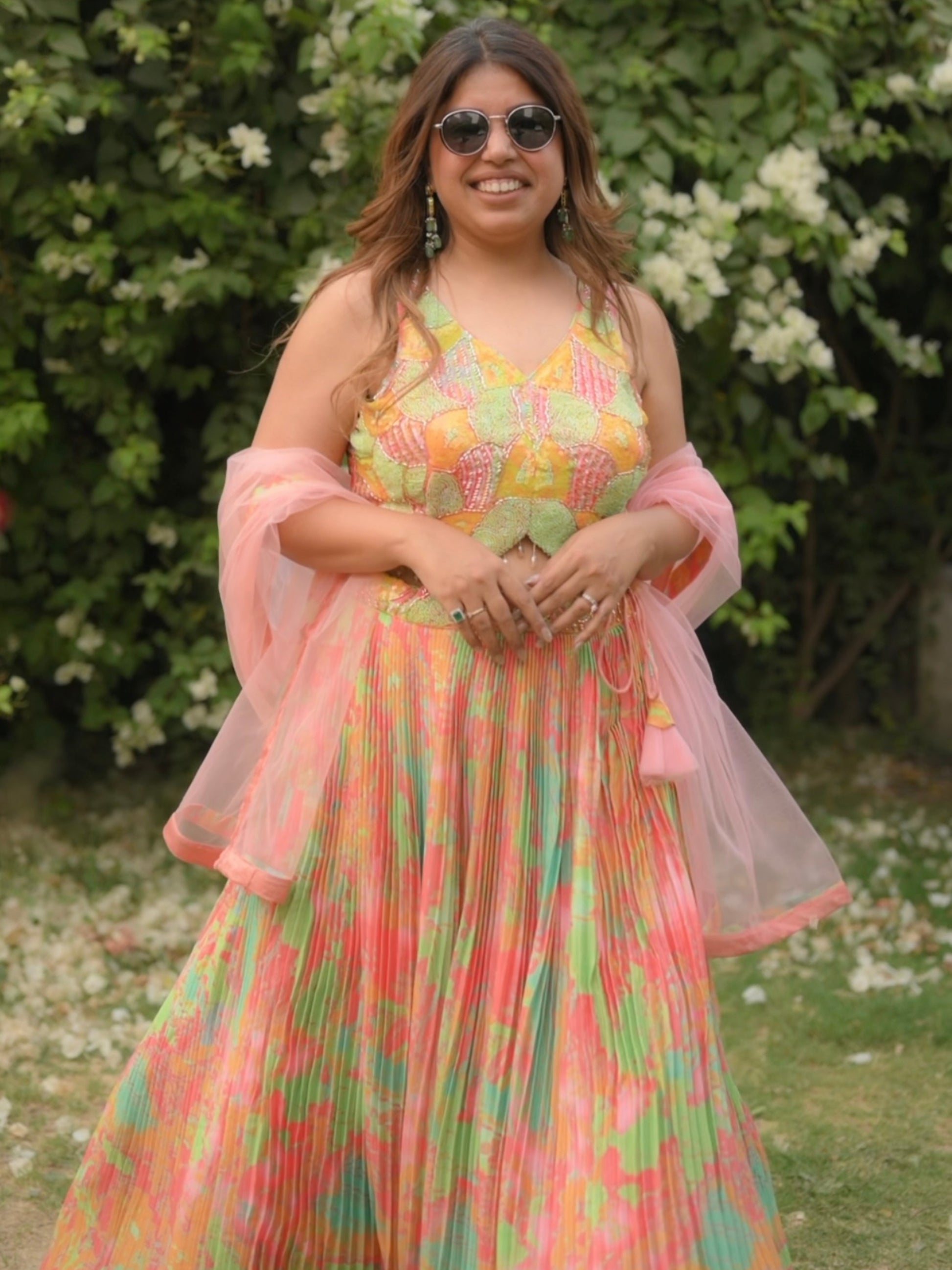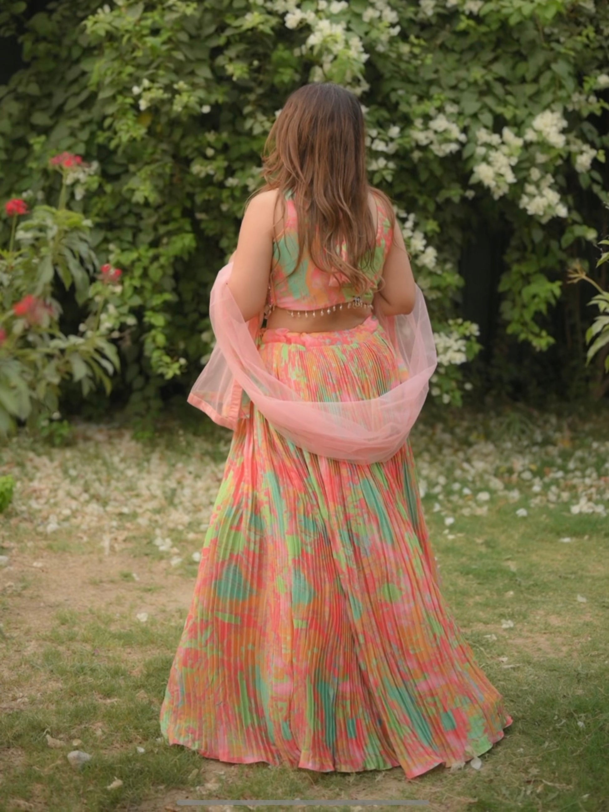 Embrace summer festivities with this vibrant Pastel Garden Lehenga Set — a perfect blend of tradition and modern elegance. The ensemble features a beautifully embroidered sleeveless blouse with mirror and thread work in bright, cheerful hues. The lehenga skirt steals the show with its multi-color digital floral print and fine pleated georgette fabric that adds graceful movement and flair. Paired with a soft peach organza dupatta, this outfit is perfect for mehendi, haldi, or daytime celebrations.