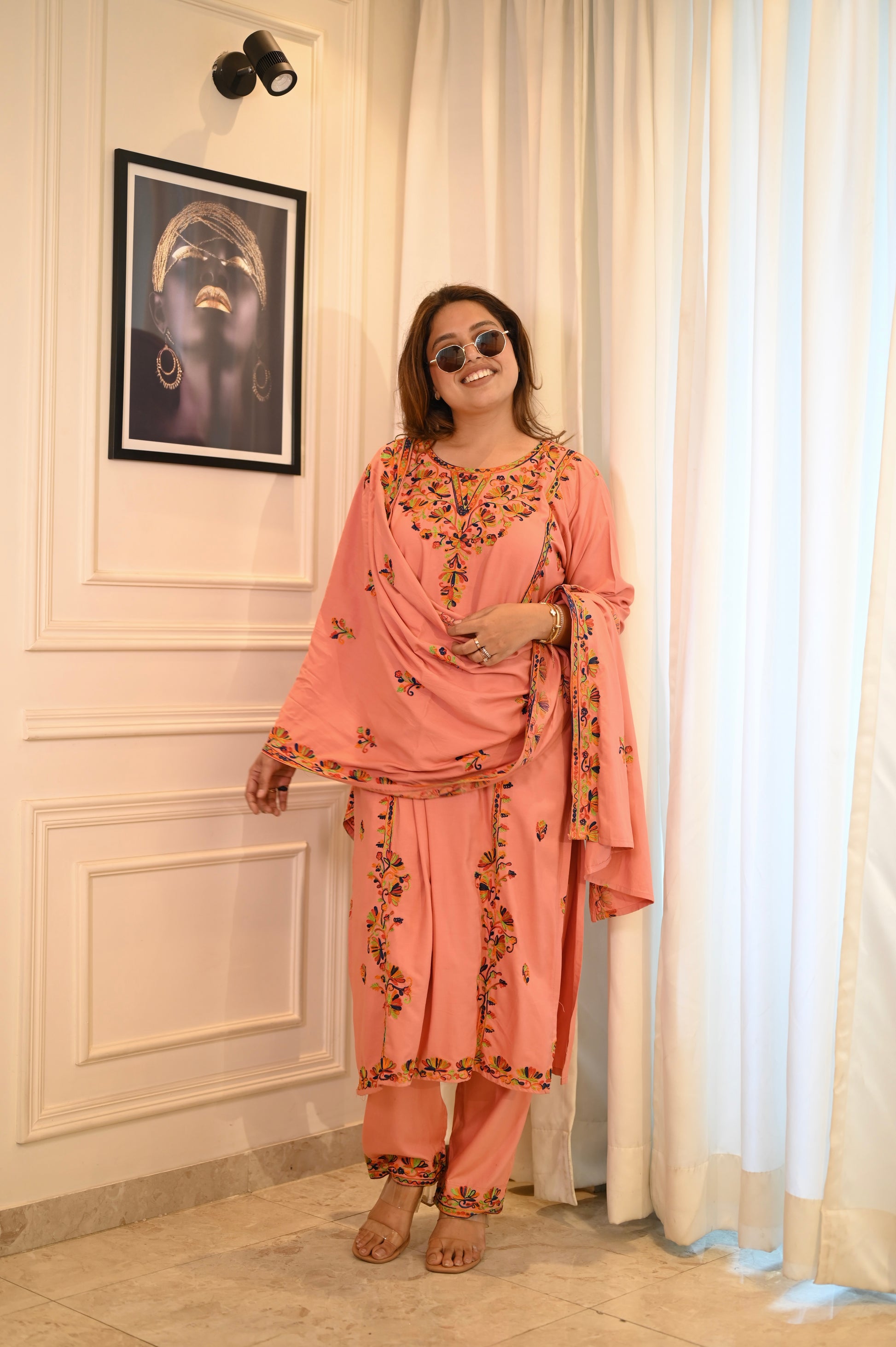 - 🌸 Color: Peach Pink with Multicolour Embroidery