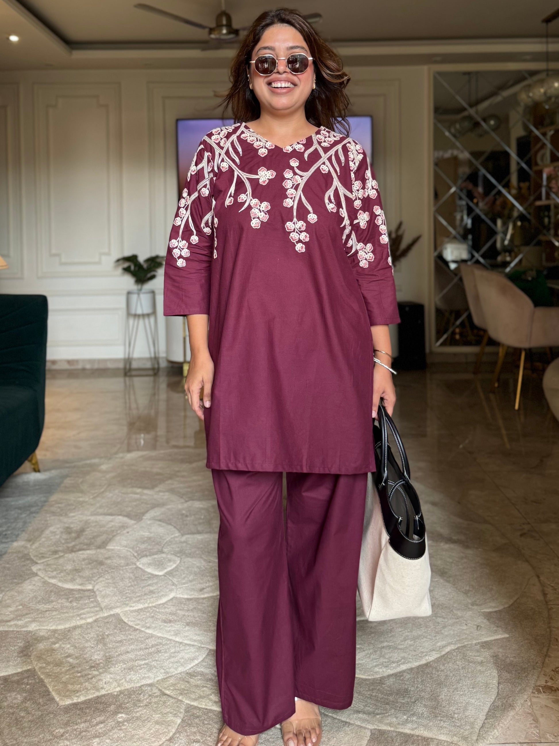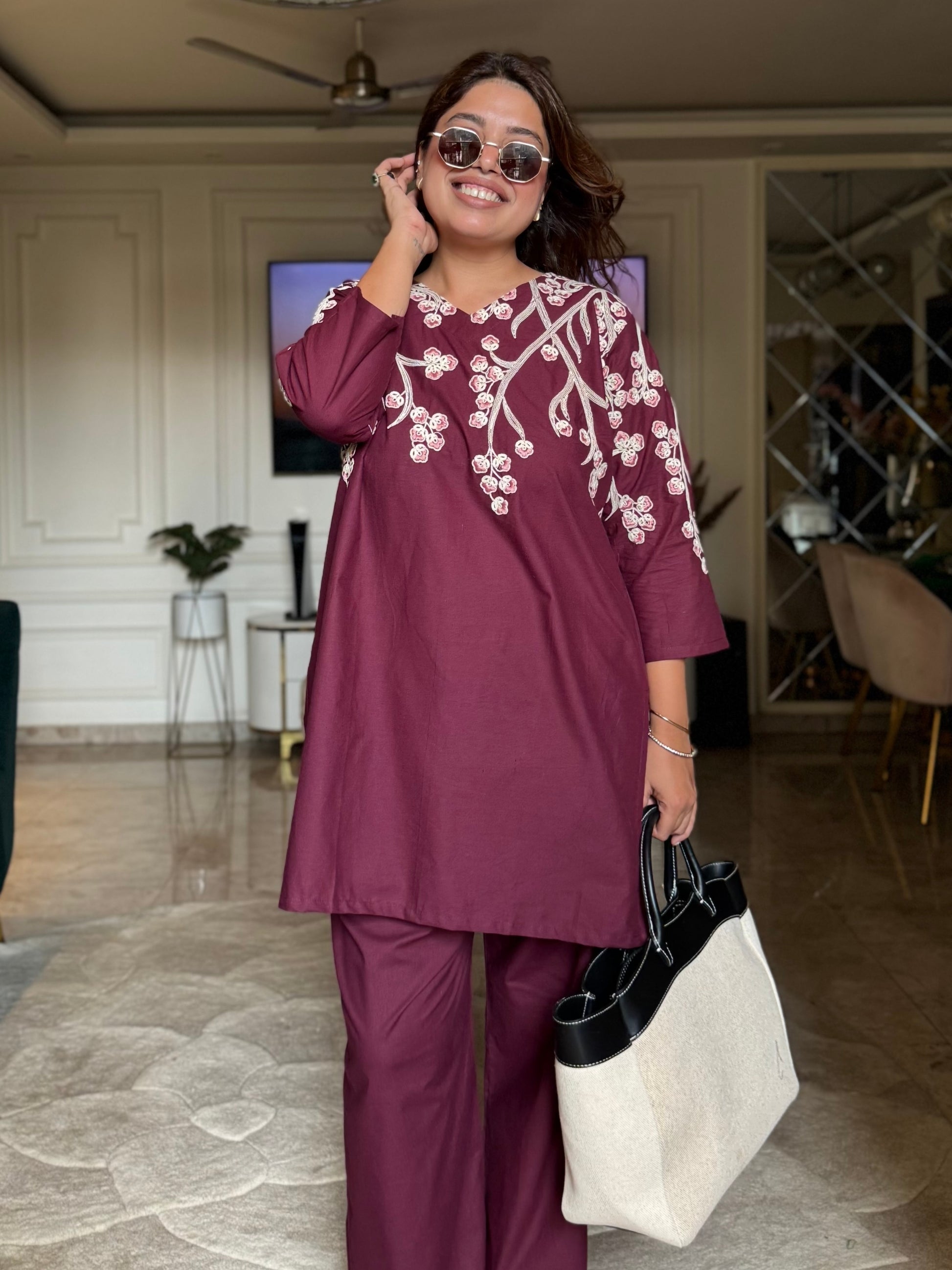 Make a statement in this deep plum co-ord set, beautifully detailed with off-white floral vine embroidery along the neckline and sleeves. Crafted from soft, breathable cotton, the set features a straight-cut kurta paired with wide-leg pants — offering both elegance and comfort. The rich plum tone flatters all skin tones and is perfect for everything from casual outings to cozy festive evenings.