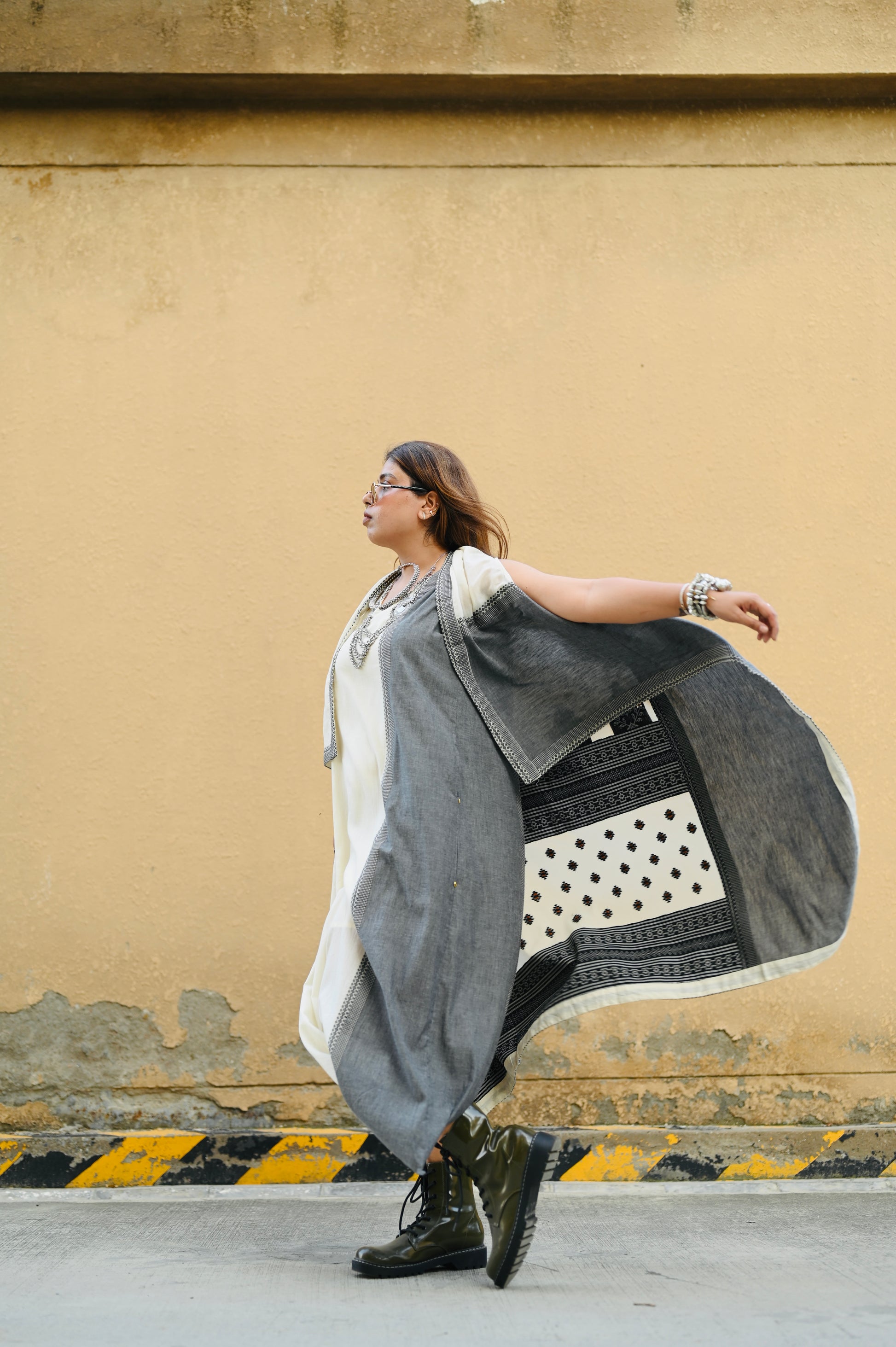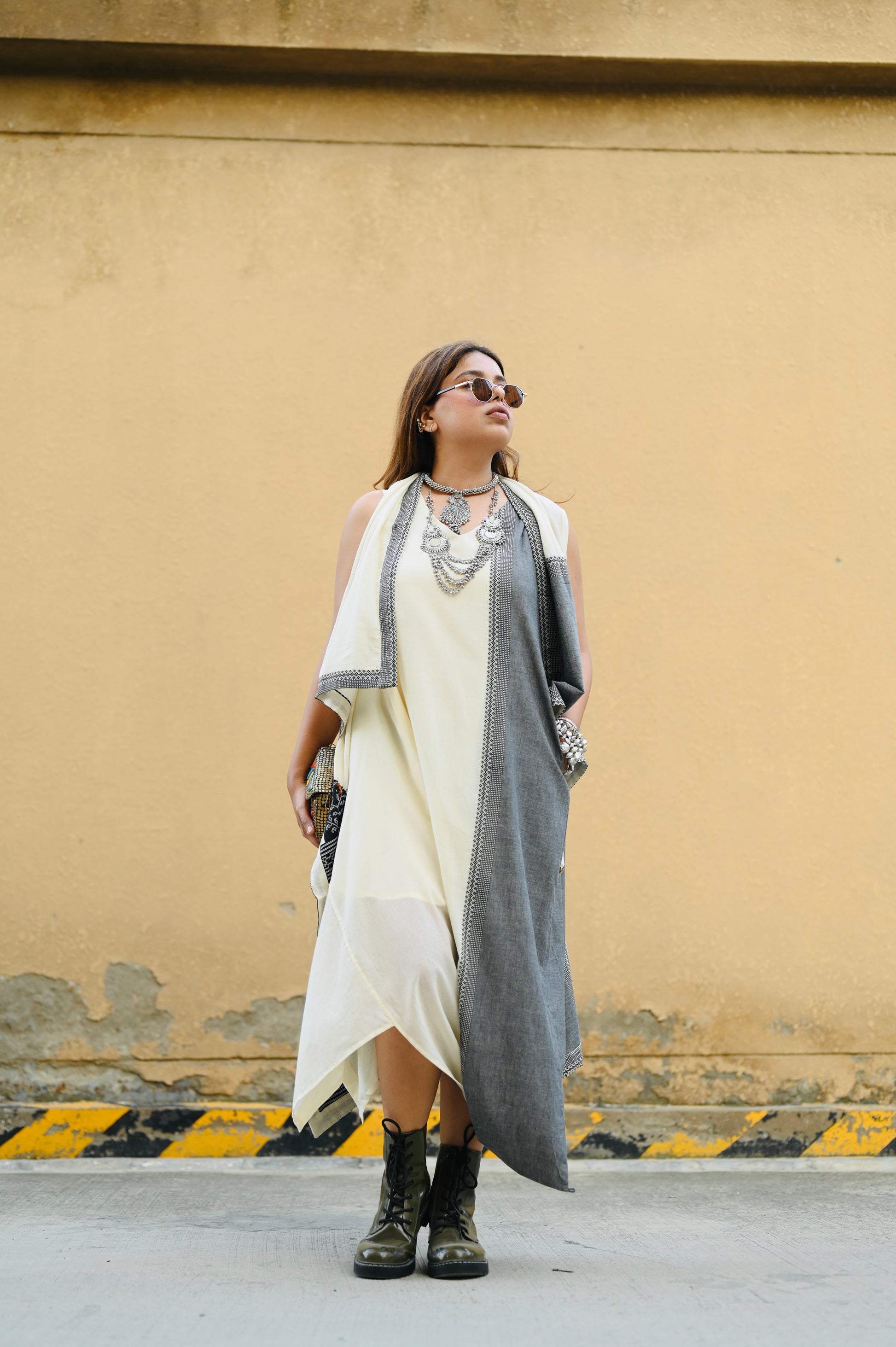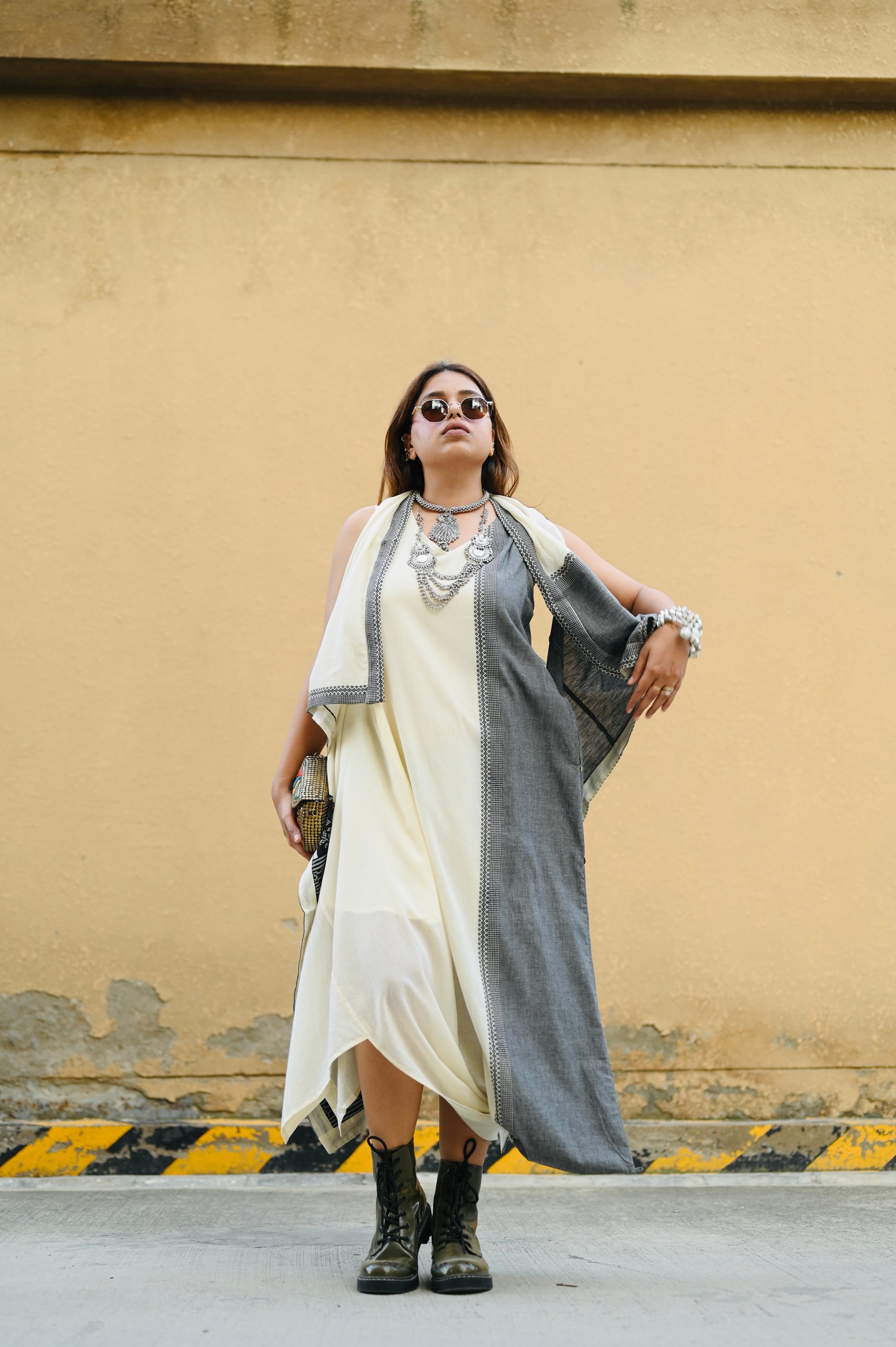 Turn heads with this effortlessly elegant ivory dress, crafted in soft, breathable fabric with a fluid asymmetric hemline. Paired with a statement dual-tone grey and ivory overlay featuring intricate border detailing, this ensemble blends minimalism with cultural charm.