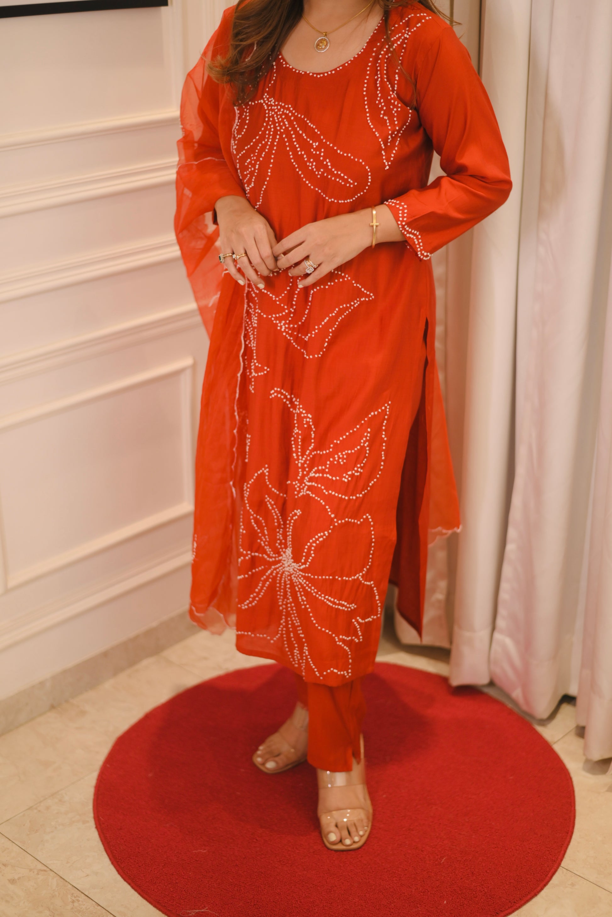 - Graceful Red outfit adorned with intricate embroidery at the front.