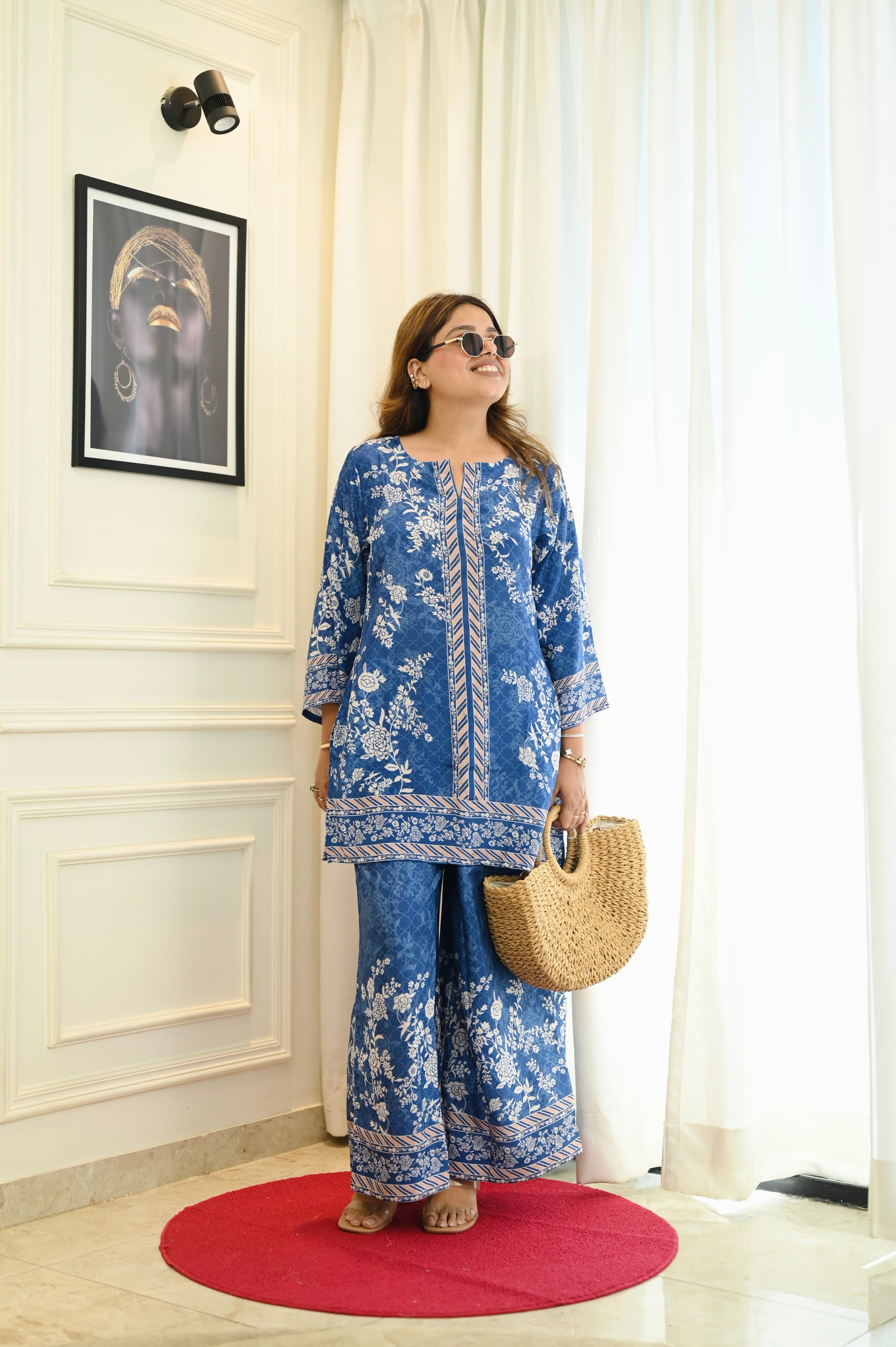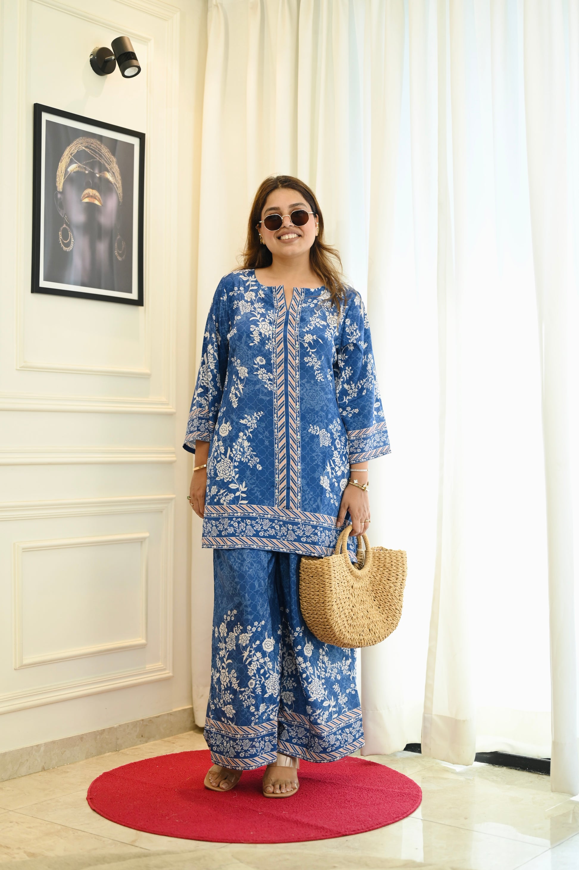 Elevate everyday style with this royal indigo blue cotton co-ord set, featuring floral prints, contrast borders, and a chic straight-fit kurta with wide-leg palazzos.Perfect for casual outings or workwear, it’s lightweight, breathable, and effortlessly elegant.