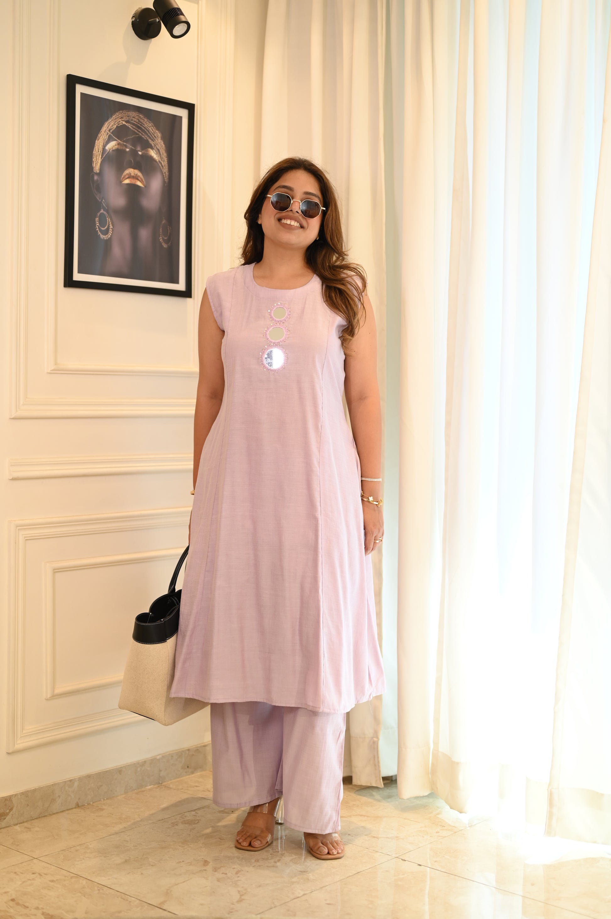 - Top Design: Sleeveless A-line kurta featuring minimalistic mirror work on the front